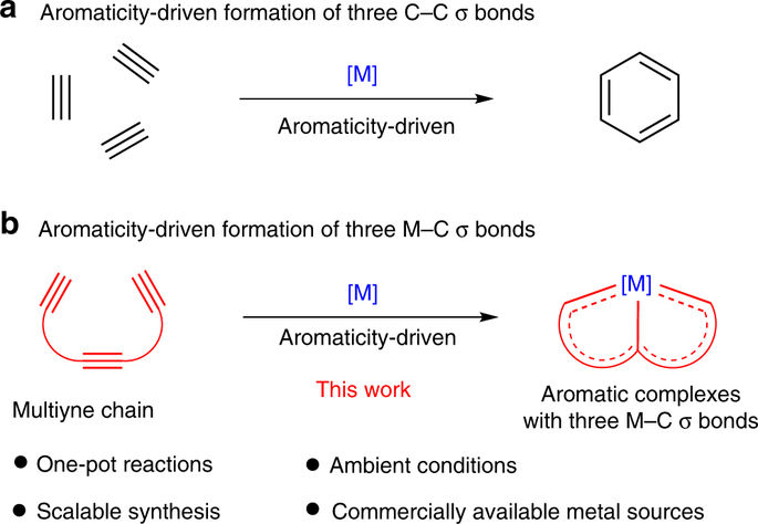 Although the formation of metal–carbon σ bonds is a fundamental principle in organometallic chemistry, the direct bonding of one organic molecule with one metal center to generate more than two metal–carbon σ bonds remains a challenge. Herein, we report an aromaticity-driven method whereby multiyne chains are used to construct three metal–carbon σ bonds in a one-pot reaction under mild conditions. In this method, multiyne chains act as ligand precursors capable of chelating an osmium center to yield planar metallapolycycles, which exhibit aromaticity and good stability. The direct assembly of various multiyne chains with commercially available metal complexes or even simple metal salts provides a convenient and efficient strategy for constructing all carbon-ligated chelates on the gram scale.