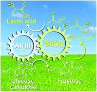 The catalytic transformation of cellulose into valuable chemicals such as lactic acid under mild conditions represents a promising route for the efficient utilization of renewable biomass. Here, we report that the combination of Al(III) and Sn(II) cations can efficiently catalyse the conversion of cellulose and related carbohydrates into lactic acid in water. Al(III)–Sn(II) is the most efficient combination for lactic acid formation among the many dual cations investigated. Al(III) and Sn(II) with a molar ratio of 1/1 work cooperatively, providing lactic acid with yields of 90%, 81% and 65% in the conversions of fructose, glucose and cellulose, respectively. The formation of lactic acid involves a series of tandem steps including the hydrolysis of cellulose to glucose, the isomerisation of glucose to fructose, the retro-aldol fragmentation of fructose to C3 intermediates and the subsequent conversion of the C3 intermediates to lactic acid. Our experimental and computational studies suggest that Al(III) mainly catalyses the isomerisation of glucose or the C3 intermediates, whereas Sn(II) is primarily responsible for the retro-aldol fragmentation. The combination of the two cations enables the reaction to proceed smoothly with few side reactions, providing outstanding catalytic performances for lactic acid production from cellulose or the related carbohydrates.