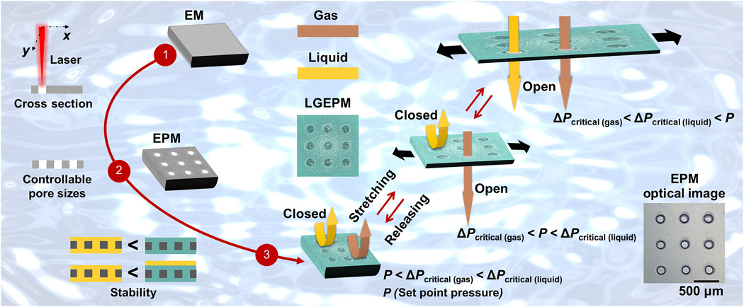 The development of membrane technology is central to fields ranging from resource harvesting to medicine, but the existing designs are unable to handle the complex sorting of multiphase substances required for many systems. Especially, the dynamic multiphase transport and separation under a steady-state applied pressure have great benefits for membrane science, but have not been realized at present. Moreover, the incorporation of precisely dynamic control with avoidance of contamination of membranes remains elusive. We show a versatile strategy for creating elastomeric microporous membrane-based systems that can finely control and dynamically modulate the sorting of a wide range of gases and liquids under a steady-state applied pressure, nearly eliminate fouling, and can be easily applied over many size scales, pressures, and environments. Experiments and theoretical calculation demonstrate the stability of our system and the tunability of the critical pressure. Dynamic transport of gas and liquid can be achieved through our gating interfacial design and the controllable pores’ deformation without changing the applied pressure. Therefore, we believe that this system will bring new opportunities for many applications, such as gas-involved chemical reactions, fuel cells, multiphase separation, multiphase flow, multiphase microreactors, colloidal particle synthesis, and sizing nano/microparticles.