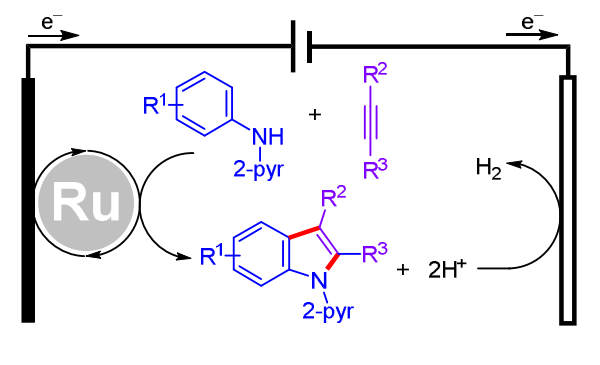 A ruthenium-catalyzed electrochemical dehydrogenative annulation reaction of aniline derivatives and alkynes has been developed for the synthesis of indoles. Electric current is used to recycle the active ruthenium-based catalyst and promote H₂ evolution. The electrolysis reaction is operationally convenient as it employs a simple undivided cell, proceeds efficiently in an aqueous solution, and is insensitive to air.
