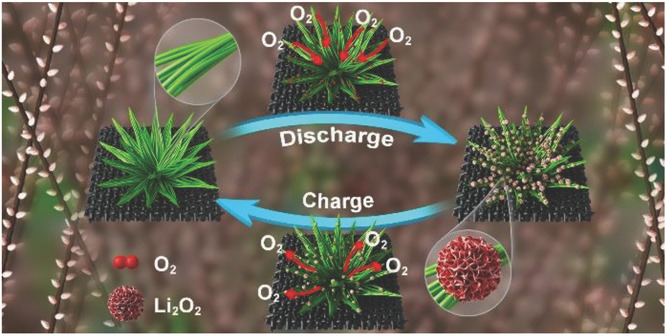 The nonaqueous lithium–oxygen (Li–O2) battery is considered as one of the most promising candidates for next‐generation energy storage systems because of its very high theoretical energy density. However, its development is severely hindered by large overpotential and limited capacity, far less than theory, caused by sluggish oxygen redox kinetics, pore clogging by solid Li2O2 deposition, inferior Li2O2/cathode contact interface, and difficult oxygen transport. Herein, an open‐structured Co9S8 matrix with sisal morphology is reported for the first time as an oxygen cathode for Li–O2 batteries, in which the catalyzing for oxygen redox, good Li2O2/cathode contact interface, favorable oxygen evolution, and a promising Li2O2 storage matrix are successfully achieved simultaneously, leading to a significant improvement in the electrochemical performance of Li–O2 batteries. The intrinsic oxygen‐affinity revealed by density functional theory calculations and superior bifunctional catalytic properties of Co9S8 electrode are found to play an important role in the remarkable enhancement in specific capacity and round‐trip efficiency for Li–O2 batteries. As expected, the Co9S8 electrode can deliver a high discharge capacity of ≈6875 mA h g−1 at 50 mA g−1 and exhibit a low overpotential of 0.57 V under a cutoff capacity of 1000 mA h g−1, outperforming most of the current metal‐oxide‐based cathodes.