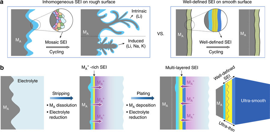 Dendrite growth of alkali metal anodes limited their lifetime for charge/discharge cycling. Here, we report near-perfect anodes of lithium, sodium, and potassium metals achieved by electrochemical polishing, which removes microscopic defects and creates ultra-smooth ultra-thin solid-electrolyte interphase layers at metal surfaces for providing a homogeneous environment. Precise characterizations by AFM force probing with corroborative in-depth XPS profile analysis reveal that the ultra-smooth ultra-thin solid-electrolyte interphase can be designed to have alternating inorganic-rich and organic-rich/mixed multi-layered structure, which offers mechanical property of coupled rigidity and elasticity. The polished metal anodes exhibit significantly enhanced cycling stability, specifically the lithium anodes can cycle for over 200 times at a real current density of 2 mA cm–2 with 100% depth of discharge. Our work illustrates that an ultra-smooth ultra-thin solid-electrolyte interphase may be robust enough to suppress dendrite growth and thus serve as an initial layer for further improved protection of alkali metal anodes.
