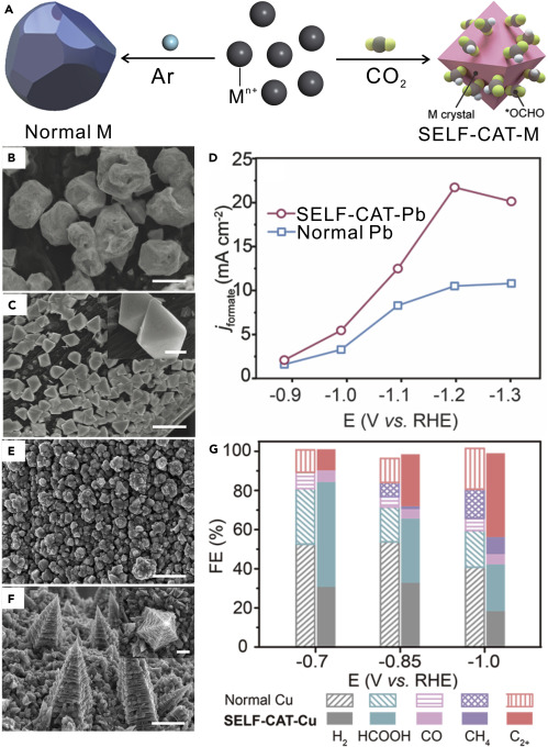 The exposed surface of metal catalysts plays a crucial role in determining their overall (electro)catalytic performance, such as activity and selectivity, creating the so-called “facet effect.” The facet effect has been recently well-demonstrated in the metal-catalyzed electroreduction reaction of CO2 (CO2RR). For example, a small portion of Cu high-index stepped facets is demonstrated as the main contributor to the overall CO2RR activity.1 Studies based on both crystalline and polycrystalline Cu catalysts also reveal that different facets of Cu vary the product selectivity. Although Cu(111) produces more CH4 than Cu(100), stepped facets exhibit an activity one order higher than that of Cu(111) toward the C-C coupled products.2 The optimized facets for CO2RR vary with metal compositions and experimental conditions as well.3 For instance, the high-index facets of Bi, such as (012) and (104), exhibit high performance for the selective production of formate.4 Both single-crystal and thin-film studies revealed that Ag(110) having the larger density of undercoordinated sites exhibited higher activity than Ag(111) and Ag(100) in CO2 reduction to CO.5, 6