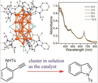 Surface organic ligands play a critical role in stabilizing atomically precise metal nanoclusters in solutions. However, it is still challenging to prepare highly robust ligated metal nanoclusters that are surface‐active for liquid‐phase catalysis without any pre‐treatment. Herein, we report a novel N‐heterocyclic carbene‐stabilized Au25 nanocluster with high thermal and air stabilities as a homogenous catalyst for cycloisomerization of alkynyl amines to indoles. The nanocluster, characterized as [Au25(iPr2‐bimy)10Br7]2+ (iPr2‐bimy= 1,3‐diisopropylbenzimidazolin‐2‐ylidene) (1), was synthesized by direct reduction of AuSMe2Cl and iPr2‐bimyAuBr with NaBH4 in one pot. X‐ray crystallization analysis revealed that the cluster comprises two centered Au13 icosahedra sharing a vertex. Cluster 1 is highly stable and can survive in solution at 80 oC for 12 h, which is superior to Au25 nanoclusters passivated with phosphines or thiols. DFT computations reveal the origins of both electronic and thermal stability of 1 and point to the probable catalytic sites. This work provides new insights into the bonding capability of N‐heterocyclic carbene to Au in a cluster, and offers an opportunity to probe the catalytic mechanism at the atomic level.