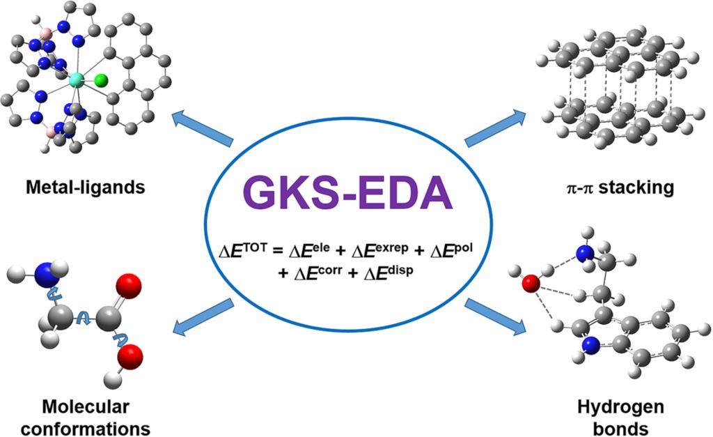Energy decomposition analysis (EDA) methods bridge the gap between electronic structure calculations and conceptual interpretations of molecular interactions. The recently developed generalized Kohn‐Sham EDA (GKS‐EDA) can be used to examine various molecular interactions with restricted, restricted open‐shell or unrestricted Kohn‐Sham orbitals. It supports different density functional theory functionals, including LDA, GGA, hybrid, double hybrid, range‐separated, and dispersion‐corrected density functionals. GKS‐EDA can be also efficiently applied for intermolecular interactions in solutions and intramolecular interactions when used in combination with an implicit solvation model and appropriate fragmentation method. GKS‐EDA helps us not only to understand but also to predict the structures and properties of various interacting systems within a unified approach.