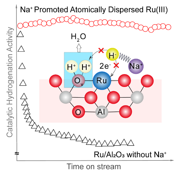 氧化物负载的金属纳米颗粒催化剂广泛应用于不同品种精细化学品(例如药物、染料、食品添加剂、香料等)的工业生产。金属纳米颗粒组分往往通过与氧化物载体之间形成较强的Md+-O2-键确保金属颗粒高度分散度和稳定性。但在催化氢化过程中,分子H2可以在金属-氧化物载体界面通过异裂方式活化为氢化物(Md+-Hδ-)和质子(O-Hδ+)。这些活泼氢物种除了参与催化底物的加氢外,还可以将界面处带正电荷的催化金属物种还原为零价金属,破坏金属-氧化物界面间的化学作用,并直接导致催化金属中心的团聚,催化性能下降。研究团队在合成Al2O3负载的单原子分散Ru催化剂(有Na+和没有Na+稳定的两种催化剂)的基础上,通过实验与理论计算的紧密结合,证明了Al2O3负载的单原子Ru催化中心附近的Na+离子在提升催化加氢性能中扮演着两种重要作用:(1)有效地阻止催化金属Ru(III)中心上活化氢化物向附近氧物种转移,防止单原子分散Ru(III)的还原团聚长大;(2)通过稳定带负电的加氢反应中间体和过渡态,提升单原子Ru(III)的催化加氢活性。系统研究表明,碱金属离子促进的Ru1/Al2O3催化剂对多种芳族和杂环底物的氢化具有很高的活性和稳定性,还存在独特的H/D反同位素效应。