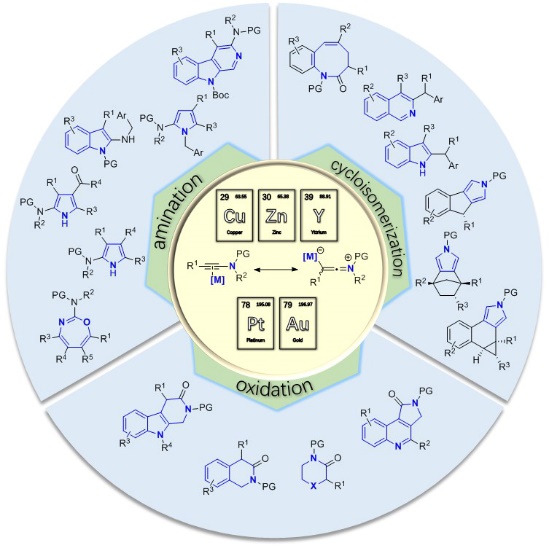 该综述对过渡金属催化炔酰胺串联反应以期发展炔酰胺的四官能团化反应的研究进行了总结,系统介绍了过渡金属催化炔酰胺氧化、胺化和环异构化引发的串联反应及其在一系列功能氮杂环(如2-二苯甲基吲哚、2-氨基吲哚、2-氨基吡咯、3-二苯甲基异喹啉、异喹啉酮、β-咔啉、吡咯[3,4-c]喹啉酮、多环吡咯、桥连吡咯、中环内酰胺等)多样性合成中的应用。特别是,课题组在炔酰胺化学研究中开发的一类新型炔烃胺化试剂--异噁唑,已被国内外二十多个课题组广泛应用。课题组建立的通过铜催化二炔环化产生铜卡宾方法可实现系列手性氮杂环的高效和高选择性合成,有力推动了炔酰胺的不对称催化研究。这些研究不仅为重要氮杂环的构建提供全新和高效的方法,并一定程度上丰富了炔烃化学和金属卡宾化学。最后,综述还对炔酰胺化学将来的发展趋势和前景进行了展望。
