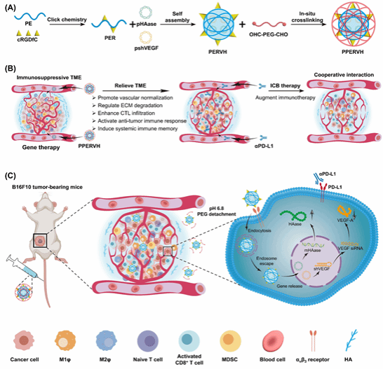 传统手术、放疗和化疗等癌症治疗方法虽有疗效,但存在术后复发、健康组织损伤、药物递送效率低等问题。基因治疗作为新兴手段,关键在于开发高效安全的基因递送系统。该团队开发的聚噁唑啉基基因递送系统(PPERD),通过靶向肿瘤血管正常化和细胞外基质降解,显著抑制肿瘤生长、复发和转移。该载体系统利用聚噁唑啉的高效转染性能和pH响应性,结合靶向配体,实现了在肿瘤微环境中的快速响应和高效递送。实验结果表明,该基因递送系统具有高效低毒、肿瘤微环境智能响应、双重治疗机制与免疫调控等特点,不仅能够有效地改善肿瘤免疫抑制微环境,还能够增强免疫检查点抑制剂的疗效,为癌症治疗提供了新思路。