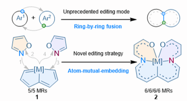本工作提出了一种全新的“原子互嵌”策略,成功实现了两个有机芳香环与两个金属芳香环的高效重构。该策略以金属杂芳香化合物1为底物,选用两种异噁唑作为氮源,通过两步反应将氮原子分别插入到不同的金属–碳键中,并借助金属中心桥连两个异噁唑片段,从而实现分子骨架的高度融合与精准控制。研究表明,反应过程中关键中间体的形成与位点选择性的控制,依赖于底物之间的精确匹配与反应条件的精细调控。金属杂芳香化合物在此策略中扮演着“分子骨架操控平台”的角色:金属中心不仅引导两个异噁唑片段对特定金属杂环的选择性识别,其环内金属–碳键还具有类卡宾性质,可驱动两个异噁唑环的开环与重组,展现出这类金属杂芳香骨架在探索新反应路径和合成新结构方面的独特优势。