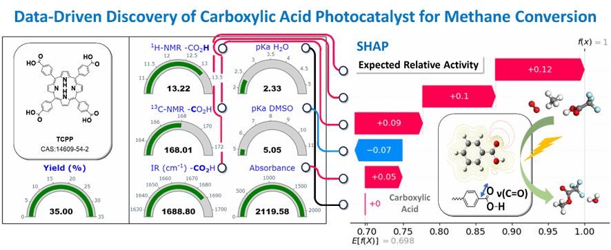 甲烷(CH₄)的高效转化是催化领域的重要挑战。汪骋教授团队意外发现共轭芳香羧酸可以作为光催化剂,在氯化钠-三氟乙酸(NaCl-TFA)介质中实现甲烷的高选择性氧化。利用实验光谱数据作为描述符,团队借助机器学习揭示了羧酸结构与其催化活性的关系,为设计高性能光催化剂提供了依据。