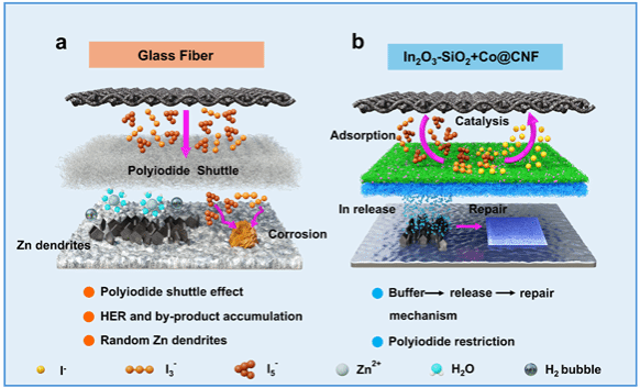 水系锌碘电池(AZIBs)凭借其本征安全性、环境友好性以及锌/碘原料的成本优势,已成为新一代电化学储能技术的研究热点。然而,电极界面的不稳定性制约了其电化学可逆性:锌负极因枝晶生长、析氢反应(HER)及副产物积累而失效;而碘正极则面临多碘化物溶解-穿梭引发的活性物质流失问题,最终限制了AZIBs的长循环性能。2023年厦门大学赵金保教授/杨阳副教授团队,设计了基于阳离子交换树脂和铁纳米颗粒修饰的单壁碳纳米管的Janus隔膜(DOI: 10.1002/anie.202300418),提高了锌碘电池循环稳定性。但是此Janus隔膜需要基膜(商业化玻璃纤维隔膜)支撑,厚度较厚。近日,团队进一步通过静电纺丝技术构建了一种无需基膜的一体化串联结构隔膜,厚度大幅减薄。该隔膜由具有"缓冲-释放-修复"机制的In2O3-SiO2(ISO)负极侧功能层与具备多碘化物吸附-催化功能的钴纳米颗粒负载的碳纳米纤维(Co@CNF)正极侧功能层直接串联构成,成功在高面容量水系锌碘电池(AZIBs)中构筑了双重增强的高稳定性正负极界面。得益于这种正负极界面协同稳定化作用,一体化ISO+Co@CNF隔膜将锌负极循环寿命延长至3400小时,并使得Zn-I2全电池在2.97 mAh cm-2的高面容量下稳定循环达20000圈。本工作揭示了构建双重增强的稳定界面的重要性,为高面容量AZIBs功能隔膜的设计提供了新思路。