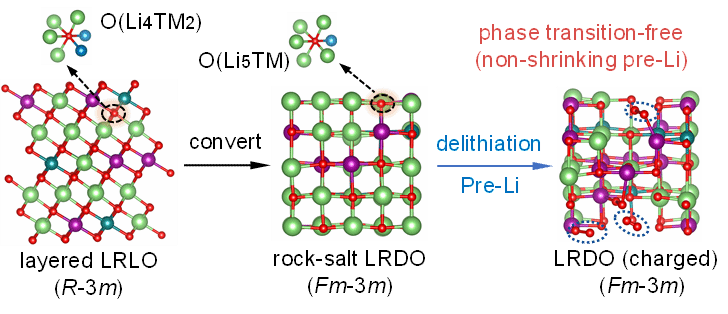 研究团队通过结构重整策略将传统的富锂层状氧化物(LRLO),成功转化为一种富锂无序岩盐氧化物(LRDO),将其从一种正极活性材料“变身”为一种高性能的“零应变”补锂剂。该LRDO实现了330 mAh/g的充电比容量,并保持了130 mAh/g的可逆容量(贡献了200 mAh/g的不可逆补锂容量)。与层状结构LRLO相比,LRDO中的阳离子无序结构调节了氧的局部共价环境,在更低的电位下(< 4.5 V)完全激活了与氧相关的阴离子氧化活性。此外,结合氟代电解液添加剂,使得LRDO在脱锂过程中释放的亲核氧物种得到了协同利用,在电池形成过程中构建了具有增强界面稳定性的梯度正极-电解质界面CEI膜结构。最重要的是,在补锂过程中,LRDO的无相变特性完全消除了体积收缩,有效防止了电极结构的退化,真正实现了补锂剂的高效利用,显著提高了锂离子电池的能量密度。