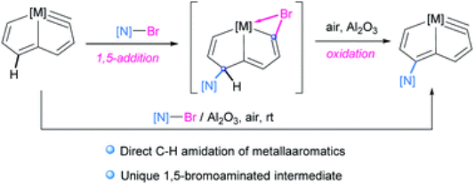 摘要:The direct C–H amidation or imidation of metallaaromatics with N-bromoamides or imides has been achieved under mild conditions and leads to the formation of a family of N-functionalized metallapentalyne derivatives. A unique 1,5-bromoamidated species has been identified, and can be viewed as a σH-adduct intermediate in a nucleophilic aromatic substitution. The 1,5-addition of both electrophilic and nucleophilic moieties into the metallaaromatic framework demonstrates a novel pathway in contrast to the typical radical process of arene C–H amidation involving N-haloamide reagents.