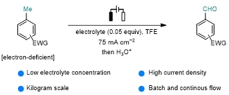 针对上述问题,本研究报道了一种实用且可规模化的电化学氧化方法,用于将缺电子甲基芳烃氧化为芳香醛。该方法无需化学氧化剂和均相过渡金属催化剂,可在工业可行的高电流密度(75 mA·cm⁻²)、低电解质用量(0.05 当量)以及无隔膜电解槽条件下高效运行,生成可水解为芳香醛的缩醛中间体。低电解质负载不仅降低了成本、简化了分离,还提高了阳极氧化选择性,确保了方法的高效与实用。该策略底物适用性广,兼容间歇和连续流电合成体系,并成功实现公斤级合成,为缺电子芳香醛的绿色、安全和规模化制备提供了切实可行的解决方案。