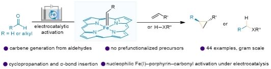 受到低价铁物种对CO2亲核活化机制的启发,徐海超教授课题组提出:醛羰基或可通过亲核型低价金属中心实现类似活化。基于这一设想,研究团队利用电化学方法原位构建低价铁(I)卟啉电催化剂,通过铁(I)对醛羰基的亲核加成,并在阴极电位下诱导α-消除,成功生成高反应性的铁卡宾中间体,从而建立了醛向金属卡宾的直接电催化转化策略。这一路径有效绕开了传统羰基还原体系所面临的能垒限制。所得铁卡宾可高效参与烯烃环丙烷化以及X–H(X = Si、S、N)键插入反应,展现出广泛的底物适用性、优异的官能团耐受性及良好的电化学可操作性,为构建多样化有机分子的卡宾转化提供了绿色高效的新途径。