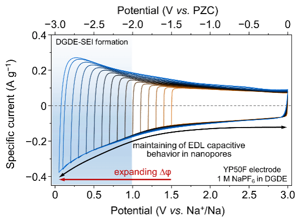 超级电容器较低的能量密度,主要受制于两个因素:一是双电层存储容量低,二是为避免形成固体电解质界面(SEI)膜,其工作电压窗口较窄。例如多孔碳负极在低电位下,碳酸酯电解液会发生大量分解,在多孔碳表面形成具有筛分作用的厚SEI膜,破坏了溶剂化离子在纳米孔中的双电层吸附。