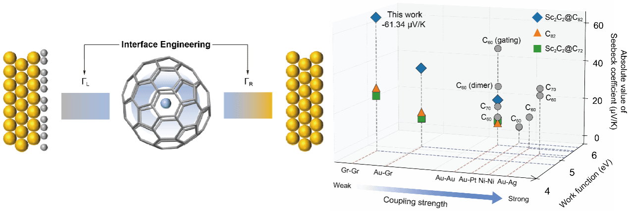 随着电子器件不断向微型化和高密度集成方向发展,单分子热电器件因其在片上热管理方面展现出的潜力而受到广泛关注,也是未来分子智能芯片的关键技术之一。在众多分子材料体系中,基于富勒烯的单分子结已被实验证实可产生显著高于传统有机体系的热电势。理论研究进一步表明,当分子与电极之间的耦合被有效削弱,甚至实现解耦时,其热电势有望得到进一步提升。然而,由于在单个富勒烯与电极界面精确调控耦合强度具有相当大的实验挑战,以石墨烯材料为电极构建富勒烯单分子范德华结为解决这一问题提供了理想的平台,相比金电极,石墨烯更低的功函数使费米能级更靠近最低非占据轨道,且其与分子形成的范德华结可弱化界面耦合,从而有望增强热电输运,也为深入理解富勒烯分子结中的界面耦合机制奠定基础。