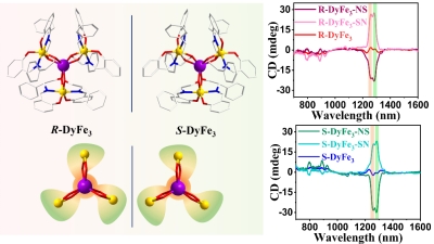 孔祥建教授与龙腊生教授团队基于前期在手性稀土-过渡金属团簇磁光效应的研究基础,设计合成一对具有三叶螺旋桨结构的3d-4f手性簇合物R/S-DyFe3,其中Dy3+离子同时作为手性中心和磁性中心。磁光测试表明,在 ±1.6 T 外加磁场下,该体系在近红外区表现出圆二色(CD)信号的显著增强且可逆的磁调控信号反转。研究表明,这种强的磁光响应主要是由于磁性和手性同源的Dy3+离子在磁场下的塞曼分裂和 4f 子能级混合显著增强了磁圆二色性(MCD)的贡献。该工作为发展具有磁场调控能力的手性光学分子材料提供了新思路。