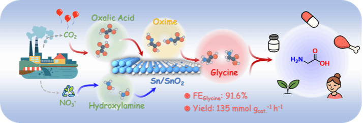 甘氨酸是一种不可或缺的氨基酸,对多种生物过程至关重要,电化学合成利用可再生电力驱动,为甘氨酸的绿色生产提供了可持续路径。但电催化合成甘氨酸仍受限于选择性和产率不足,主要源于反应中涉及的多步质子耦合电子转移过程及竞争性副反应的普遍存在。围绕这一挑战,本工作报道了一种高效的电化学合成甘氨酸的方法:通过富氧空位的莫特-肖特基 Sn/SnO2 异质结催化剂将草酸(H2C2O4)与羟胺(NH2OH)或硝酸盐(NO3–)进行还原偶联。