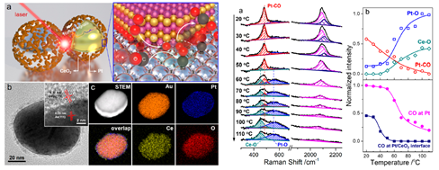 在该工作中,课题组将CeO2沉积于Au@Pt核壳纳米颗粒表面,构筑了丰富的Pt-CeO2界面。借助等离激元金内核对拉曼信号的放大作用,成功实现了Pt-CeO2界面上CO氧化时分子氧的活化和反应过程的原位拉曼光谱研究,直接观察到界面上不同活性氧物种的生成与动态变化。结果显示,分子氧可在Pt-CeO2界面处的Ce3+缺陷位点处迅速解离为Pt-O和Ce-O物种。进一步的原位时间分辨SERS研究和DFT理论计算表明,相较于Ce-O而言,Pt-O具有更高的CO氧化反应活性。这项工作加深了对Pt-CeO2界面处氧活化和CO氧化分子机制的理解,并为多相催化反应条件下氧物种的原位表征提供了一种新思路。