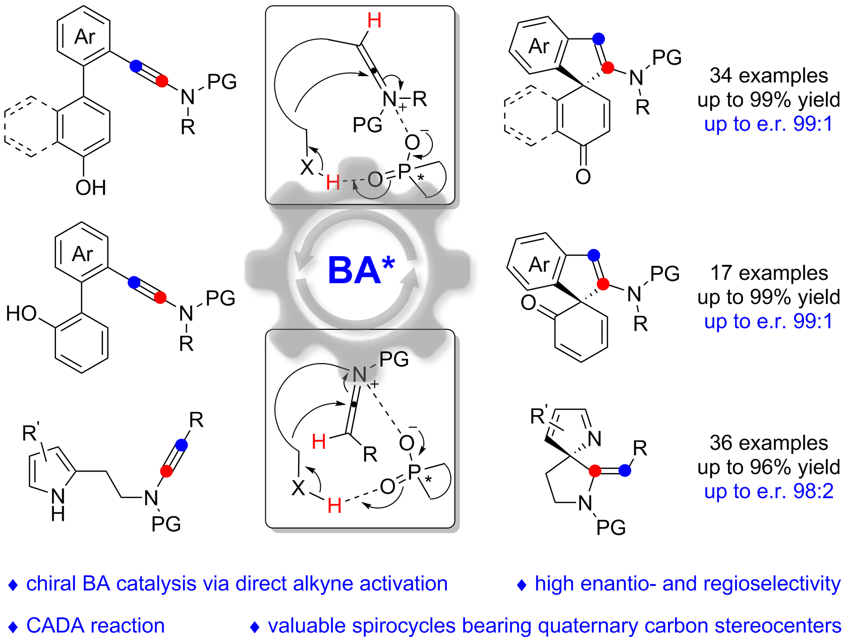 叶龙武教授课题组长期致力于炔烃转化化学研究(Acc. Chem. Res. 2020, 53, 2003; Chem. Soc. Rev. 2020, 49, 8897; Chem. Rev. 2021, 121, 9039)。近期,课题组基于其前期非金属催化炔酰胺成环反应的研究基础(Angew. Chem. Int. Ed. 2019, 58, 16252; Nat. Commun. 2019, 10, 3234; Chem. Sci. 2019, 10, 3123; Cell Rep. Phy. Sci. 2021, 2, 100448),通过氢键导向的紧密离子对策略,从带氢键给体芳基取代的炔酰胺底物出发,以各类市售可得的手性磷酸作为催化剂,成功实现了系列基于手性磷酸直接活化碳碳三键的催化不对称去芳构化反应(CADA)。该反应具有以下特点:(1)首次实现了基于直接活化碳碳三键的手性Brønsted酸催化;(2)首次报道了无金属催化的基于吡咯的不对称去芳构化反应和基于苯酚邻位与炔烃的催化不对称去芳构化反应;(3)具有优秀的化学选择性、区域选择性和对映选择性;(4)具有很好的底物普适性,可兼容萘酚、苯酚和吡咯等各类芳环,从而实现系列含手性季碳中心螺环化合物的高原子经济性合成,为有机合成和药物化学提供了广阔的应用前景;(5)通过密度泛函理论(DFT)计算,进一步明析了该类成环反应的不对称诱导模式,即通过氢键导向的离子对作用。该工作不仅为手性有机酸催化提供了新活化模式,也为药物活性分子的高对映选择性合成提供了新途径和新方法。