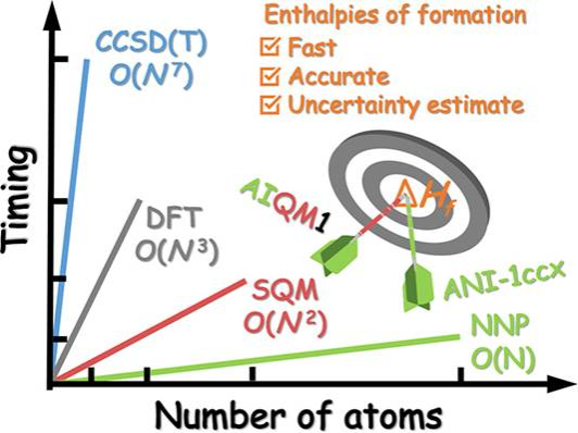 摘要:Enthalpies of formation and reaction are important thermodynamic properties that have a crucial impact on the outcome of chemical transformations. Here we implement the calculation of enthalpies of formation with a general-purpose ANI-1ccx neural network atomistic potential. We demonstrate on a wide range of benchmark sets that both ANI-1ccx and our other general-purpose data-driven method AIQM1 approach the coveted chemical accuracy of 1 kcal/mol with the speed of semiempirical quantum mechanical methods (AIQM1) or faster (ANI-1ccx). It is remarkably achieved without specifically training the machine learning parts of ANI-1ccx or AIQM1 on formation enthalpies. Importantly, we show that these data-driven methods provide statistical means for uncertainty quantification of their predictions, which we use to detect and eliminate outliers and revise reference experimental data. Uncertainty quantification may also help in the systematic improvement of such data-driven methods.