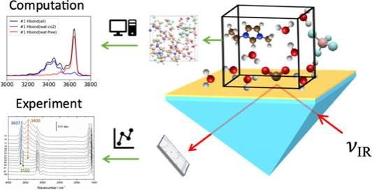 摘要:We report a combined computational and experimental work aimed at estimating the equilibrium potential for the electroreduction of CO2 to CO2– (widely accepted to be a crucial and overpotential-determining step) and at providing an alternative view on the reason behind the lower overpotential for CO2 reduction in imidazolium-based ionic liquid/water mixtures. To begin with, we obtained an 80 ps ab-initio molecular dynamics trajectory of the CO2– solvation structures in an 18% EMIM–BF4/water mixture, which delivered no evidence of interaction between EMIM+ and CO2–. Next, using the Fc+/Fc couple as the non-aqueous reference, we calculated the equilibrium potential of the CO2/CO2– couple in the mixture and aligned it with the aqueous SHE scale, proving that the equilibrium potential of CO2/CO2– in the mixture is about 0.3 V less negative than in the aqueous medium. We then looked for the origin of this catalytic effect by comparing the computed vibrational spectra with experimental Fourier transform infrared spectra. This revealed the presence of two water populations in the mixture, namely, bulk-like water and water in the vicinity of EMIM–BF4. Finally, we compared the hydrogen bonding interactions between the CO2– radical and H2O molecules in water and in the mixture, which showed that stabilization of CO2– by water molecules in the EMIM–BF4/water mixture is stronger than in the aqueous medium. This suggests that water in EMIM–BF4/water mixtures could be responsible for the low overpotential reported in these kinds of electrolytes.