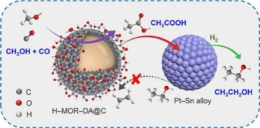 摘要:The direct synthesis of ethanol from methanol via precise C–C coupling is a highly attractive but challenging target. Herein, we report the selective production of ethanol from methanol in the presence of syngas (CO/H2) by tandem catalysis over composite catalysts composed of mordenite (H–MOR) zeolite coated by carbon layer (H–MOR–DA@C) and Pt–Sn/CNT. This tandem route starts from methanol carbonylation with CO to acetic acid over H–MOR–DA@C, followed by acetic acid hydrogenation to ethanol over Pt–Sn/CNT. The selectivity of ethanol reached up to 60% with a CH3OH conversion of 98%. As compared to the H–MOR–DA matrix, the side reaction of ethanol dehydration to ethylene is effectively hindered over composite catalysts with H–MOR–DA coated by carbon layer. The special “carbon nest” with oxygenated functional groups such as ester or carboxylic acid, existing on the surface of H–MOR–DA@C, is crucial to preventing ethanol from dehydration, and thus improves the ethanol selectivity and catalytic stability. This work offers an effective strategy for direct synthesis of ethanol from methanol and design of efficient composite catalysts for tandem catalysis by controlling the reaction pathway.