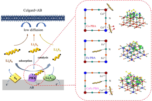 摘要:The mechanism of multifunctional sulfur-fixing materials on molecular / atomic level is important for selecting and designing effective electrocatalysts for lithium-sulfur batteries (LSBs). Therefore, metal coordination compounds (M = Co / Fe / CoFe) with unique catalytic behavior are selected as cathode additives to promote the sluggish reaction kinetics caused by multiphase conversion and focus on adsorption-catalysis mechanism. It is found that Co sites are conducive to promoting the generation of lithium sulfide that increase the specific discharge capacity, while Fe sites are beneficial for the adsorption of polysulfides that increase the capacity retention. The combination of Co and Fe sites can inhibit the polysulfides diffusion and induce the rapid and uniform deposition of lithium sulfide. Benefiting from the dual-anchoring of efficient Metal-S and Li-N bonds and special catalysis of Co sites, the CoFe PBA@S cells exhibit remarkable cyclability and capability. The cell delivers a small capacity fading rate (0.052% per cycle over 1000 cycles at 2 A g−1), excellent rate capability (811.86 mAh g−1 at 5 A g−1) and ultrahigh capability retention (1143.7 mAh g−1 after 100 cycles at 0.2 A g−1). Even with a high sulfur loading of 5 mg cm−2, it still shows reversible capacity of 789.7 mAh g−1 after 100 cycles at 0.2 A g−1. This work provides a rational direction to select and design effective electrocatalysts for LSBs.