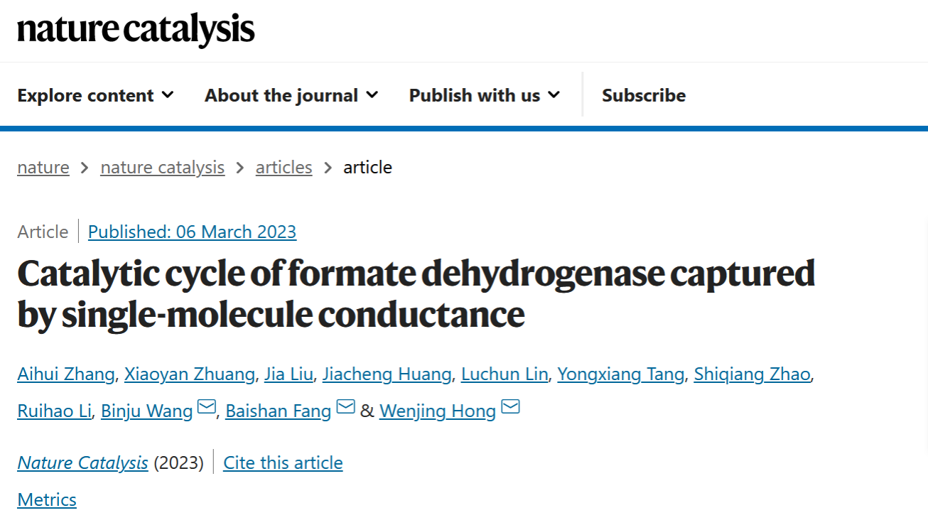 我室王斌举教授课题组和洪文晶教授课题组合作,通过单分子电导原位表征了甲酸脱氢酶催化过程,揭示单分子尺度下甲酸脱氢酶催化过程中有别于教科书经典机制的反应机制,相关研究成果以“Catalytic cycle of formate dehydrogenase captured by single-molecule conductance”(基于单分子电导表征的甲酸脱氢酶催化循环)为题发表在Nature Catalysis (DOI: 10.1038/s41929-023-00928-1)。