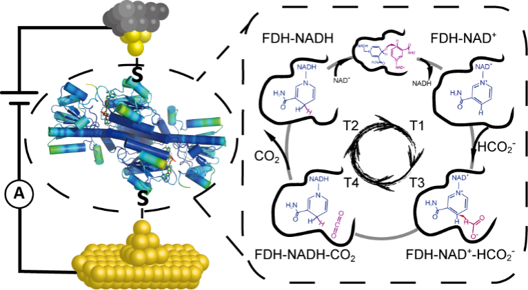 单分子电导表征的甲酸脱氢酶催化反应循环示意图及其催化新机制