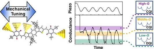 分子电子学的初衷是在单分子尺度上创造功能性电子器件。不同于宏观电子器件,单分子电子器件可以通过改变电极间隙实现对分子结构型的原位调控,这使得单分子结的电子输运性质具有可机械调谐的特点。然而,由于单分子结的电导主要取决于分子骨架结构,这导致基于机械调谐的电导变化通常不超过两个数量级。进一步增大电导的可调谐范围仍然是单分子机电器件研究的重要挑战。