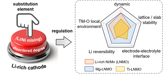 我室乔羽教授课题组以Mg/Ti取代Li1.2Ni0.2Mn0.6O2为例,结合全面表征与分析,细致探讨与分析了以上三点问题:(1)准确确定了惰性元素Mg和Ti在LNMO中取代指定的固有元素Ni和Mn,同时,原有的占据位点分布情况,即无序程度被不同的取代元素所打乱。(2)证明了无序度对结构稳定性的影响,包括TM-O局部环境、晶格/层板和界面的稳定性、阴离子氧化还原的可逆性、Li+转移的可逆性以及动力学的变化,无序度越小,结构稳定性越强。(3)区分明显的无序度同时印证着电池电化学性能的发展趋势,抑制无序度可以改善电池的电化学性能,反之则会恶化电池的电化学性能。因此,所提出的研究方法和细致剖析展示了对改性(取代/掺杂)的更为现代和全面的理解,“无序度”已被证明是一个关键和强大的评估工具,可以为高能量密度阴极优化提供有力的参考。