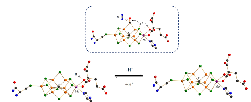 高柠檬酸是固氮酶催化活性中心的有机小分子,该论文从精确的小分子结构出发,对固氮酶局部微环境进行化学模拟。文章系统总结了高柠檬酸钼、钒络合物及其同系物的合成、反应、结构和光谱研究。通过这类小分子与蛋白活性中心配位结构的比较、铁钼辅基红外光谱和圆偏振振动光谱(VCD)的实验,确认固氮酶催化活性中心的加氢新结构Δ-MoFe7S9C(R-Hhomocit)。即高柠檬酸以α-羟基和α-羧基氧与钒(钼)螯合,固氮酶催化活性中心加底物氢。固氮酶催化活性中心不仅仅是生物固氮,还是生物加氢固氮的舞台。