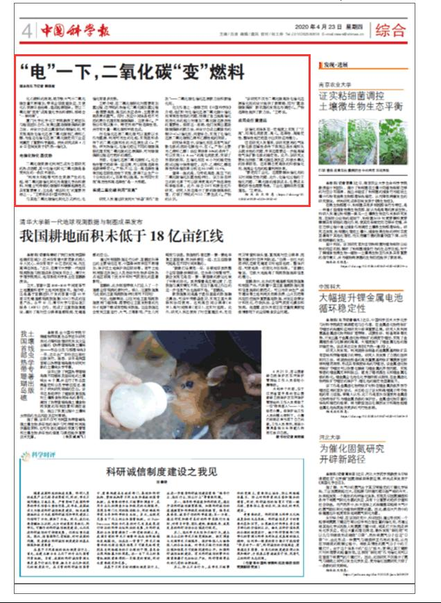 4月23日《中国科学报》就我室研究突破刊发题为《“电”一下,二氧化碳“变”燃料》的深度通讯。报道从电催化转化显优势、实现二氧化碳利用“双高”、应用尚任重道远三个方面,展示了此研究成果的重要意义。
