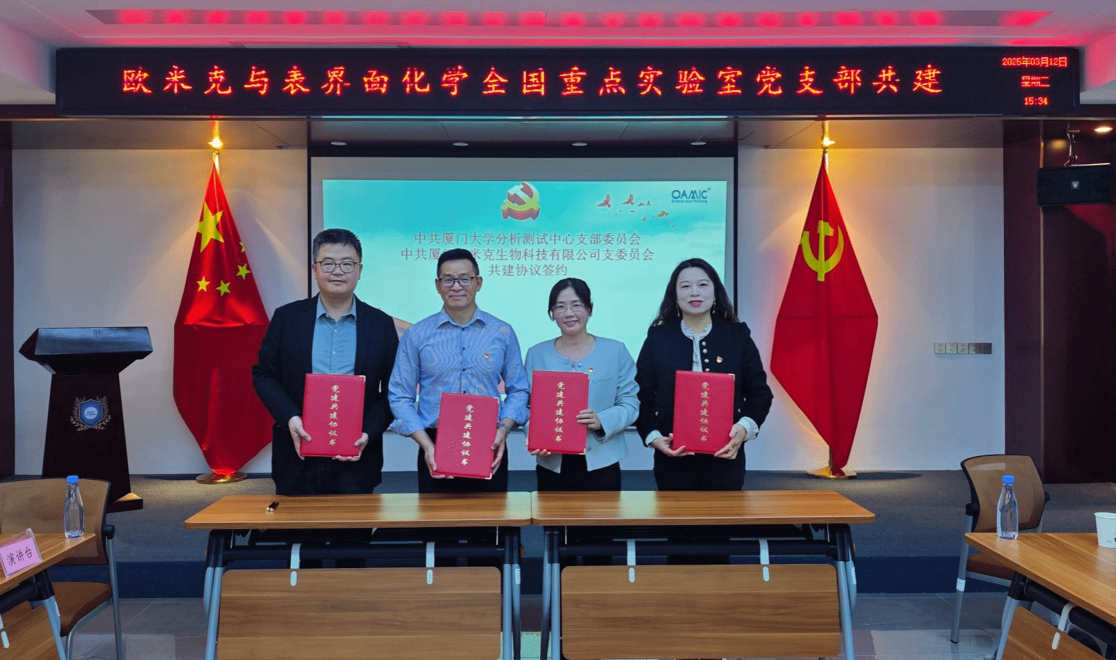 为深入学习贯彻全国两会精神,3月12日,固体表面物理化学国家重点实验室党支部(以下简称“国重室支部”)联合化学生物学系教工党支部(以下简称“化生支部”)、分析测试中心党支部,共同走进院友企业厦门欧米克生物科技有限公司(以下简称“欧米克公司”),开展了一场别开生面的固定党日+活动。国重党支部书记林清育、化生党支部书记龚磊、分析测试中心党支部书记安冬丽、欧米克支部书记朱志良等40余位党员同志参加活动。