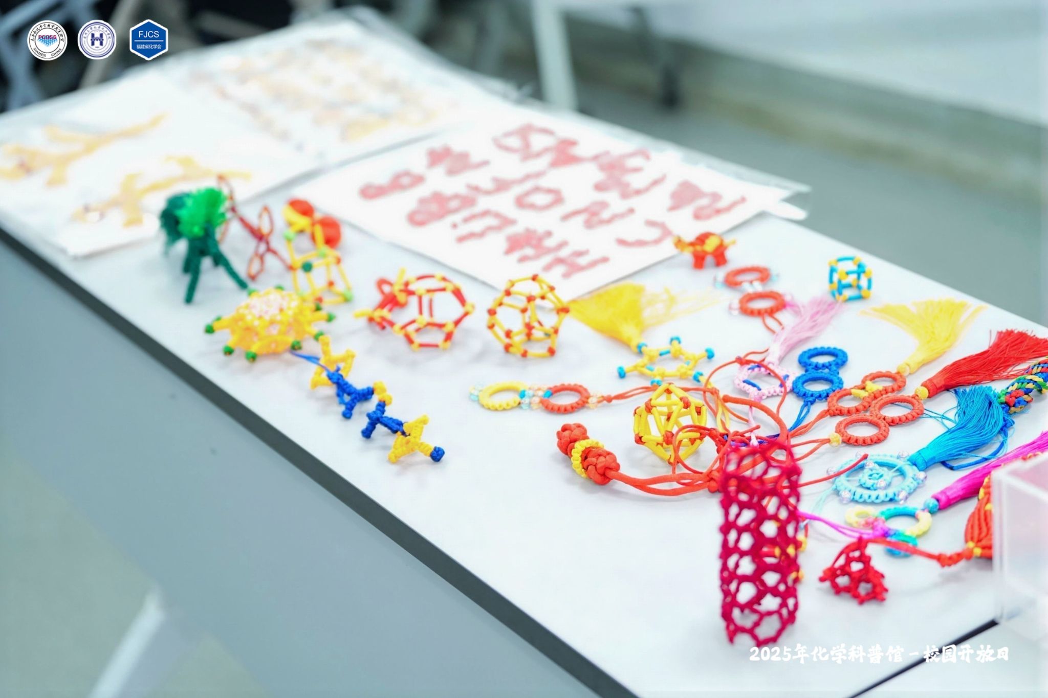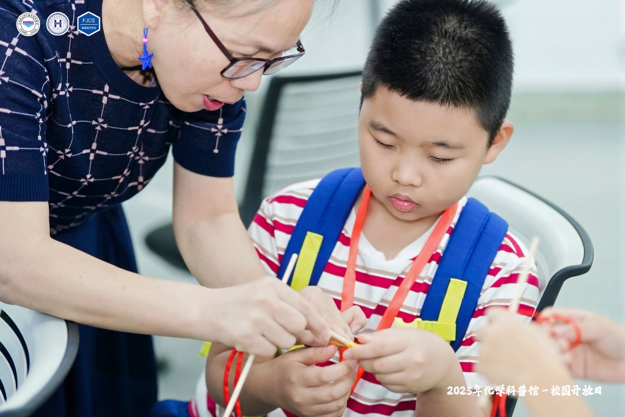 讲座结束后,五大科普实验体验环节成为活动“重头戏”。在“皂化奇旅”中,融化的皂基加入精油和玫瑰花瓣,冷却后变成独一无二的香皂,让孩子们触摸到“科研的生活温度”;而“大象牙膏”实验更是引发阵阵惊呼-过氧化氢在催化剂作用下,与洗洁精、色素共同形成的彩色泡沫汹涌而出,将“反应速率”的抽象概念化为震撼的视觉奇观;在“光影魔法-蓝晒印相探秘之旅”现场,孩子们仔细认真地在纸张上涂抹感光液,经紫外光照射、清水冲洗后,一幅幅带着普鲁士蓝的专属作品逐渐显现,不少孩子兴奋地举起作品与家长分享;“膏泽酯香-化妆品的美丽之旅”实验中,参与者亲手称量原料、混合乳化,见证“油水分离”到细腻膏霜的蜕变,直呼“原来面霜里藏着这么多化学知识”;“结绳探构”环节里,中国结的传统纹样与分子结构巧妙结合,孩子们在编织中理解原子键合排列。