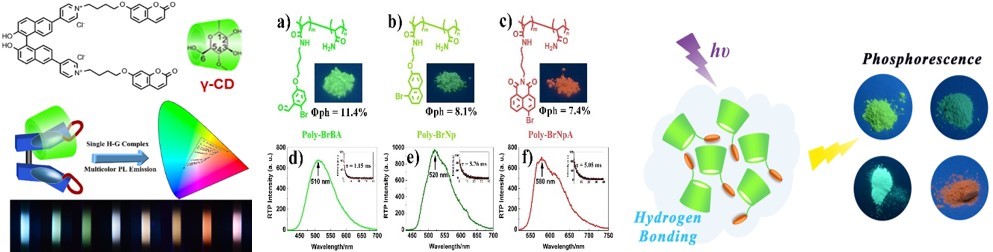 报告摘要:Stimuli-responsive functional supramolecular machines and polymers are attracting broad attention.[1] Multicolor photoluminescence, including especially white-light emission, were achieved based on host-guest supramolecular systems and even a single molecule.[2-3] Room temperature phosphorescence induced by cyclodextrin (CD-RTP) and cucurbituril (CB-RTP) is provided with the advantages of good selectivity, long life, large Stokes shifts and consequently application in the area of molecular recognition. Amorphous, efficient, room-temperature phosphorescent metal-free polymers were facilely prepared and their applications as encryption ink explored as well.[4-6] A series of amorphous organic small molecular compounds were developed with efficient RTP emission through conveniently modifying phosphor moieties to β-cyclodextrin (β-CD). The hydrogen bonding between the cyclodextrin derivatives immobilizes the phosphors to suppress the nonradiative relaxation and shields phosphors from quenchers, which enables such molecules to emit efficient RTP emission with decent quantum yields.[7] The construction of these supramolecular shuttles and polymer and their RTP function investigation would be of significant importance for the development of switchable smart materials.[8-9]